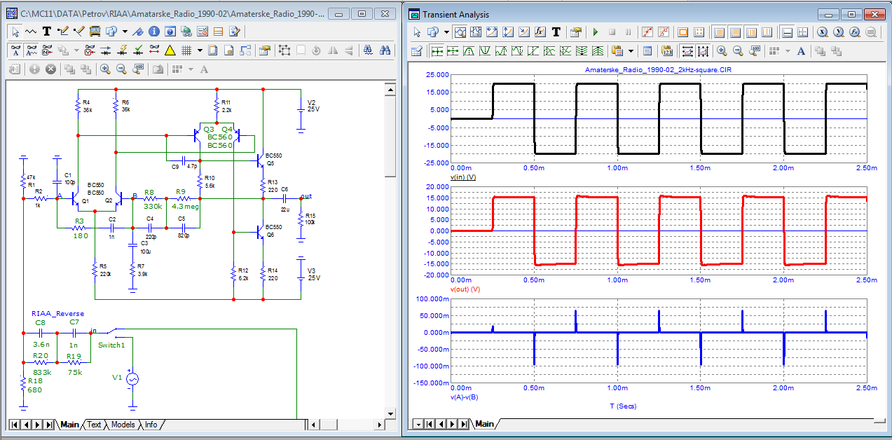 Ток входного транзистора, точка 3. В покое он равен 1,2 мА. Под действием петровского меандра ток уходит от 23 мА в насыщение до минус 95 мА на перезарядку разделительного С9 10 мкФ. Это говорит о неизбежном пробое транзистора.