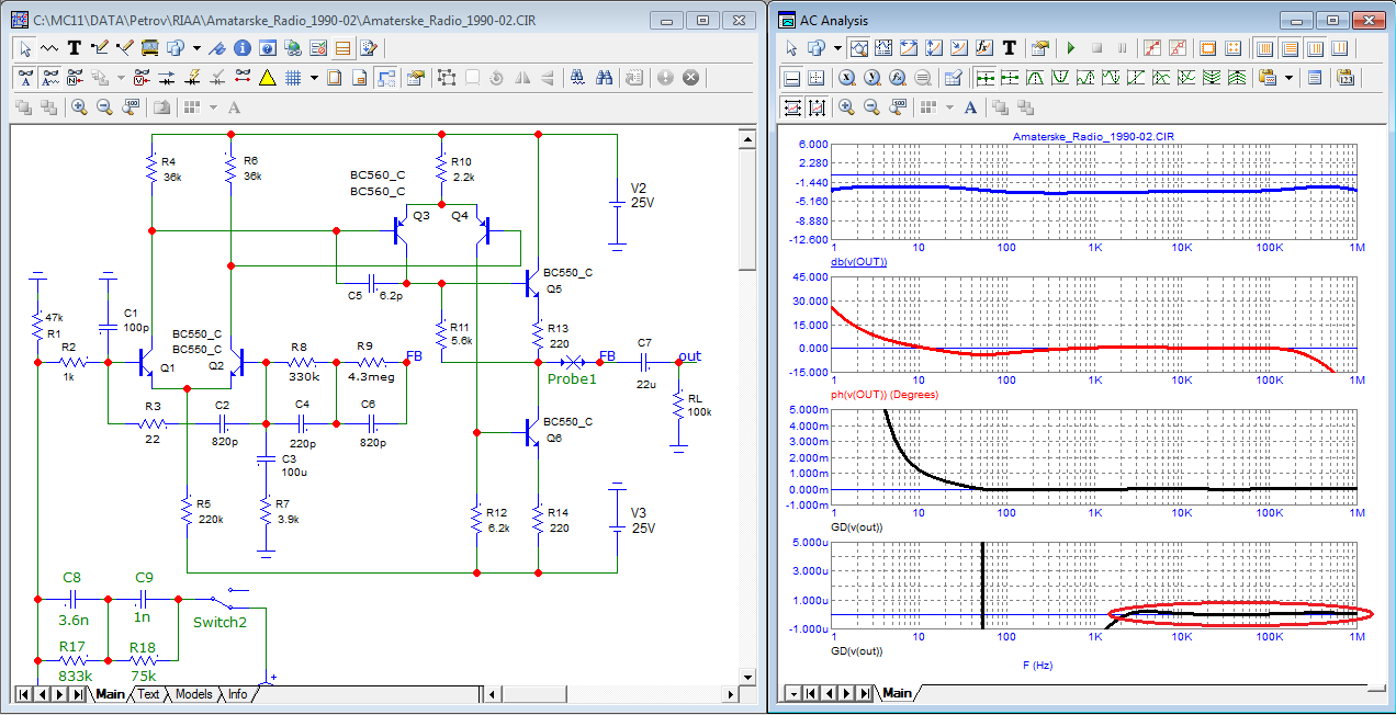 что касается усилителя из болгарского журнала, то я добавил лишь один небольшой конденсатор, возможно с оригинальными транзисторами он и не нужен. Вот его схема, диаграмма Боде и петлевое усиление. Обратите внимание на ГВЗ в диапазоне частот 1 кГц и выше, оно близко к нулю!