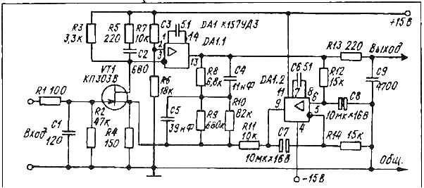 Шумовой ток базы биполярного транзистора, протекая по индуктивному импедансу головы и ёмкостному - входного разделительного С8 2,2 мкФ, приводит к падению на них шумового напряжения, приложенного ко входу УК. При типичном выходном напряжении 250 мВ напряжение шумов на выходе - 375 мкВ, что даёт отношение -55 дБ шума.
