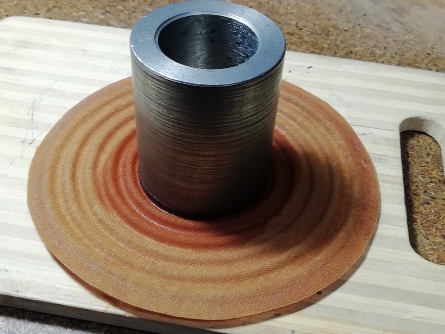 На стекло или полиэтиленовый мешок укладываем шайбу бортиком внутреннего отверстия вверх. Обильно напитываем её раствором ацетон/спирт примерно 50/50 и и нагружаем её парой цилиндрических грузиков входящих своими диаметрами во впуклости шайбы. Например крышка от детского питания ближе к центру и консервная банка ближе к наружному краю. И дать высохнуть.