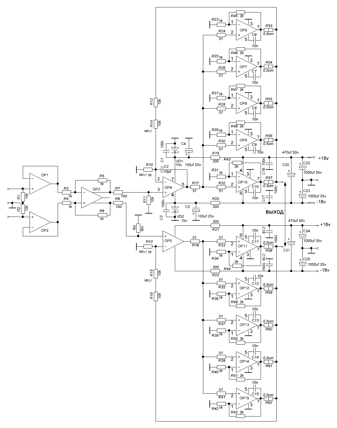 В этой схеме коэффициент усиления первой ступени для регулировки сопротивления источника равен VR1 100Ω+430Ω недостаточно, ведь 1kw вблизи значения сопротивления и искажения до минимума были невозможны. Но искажение составляет 0,005%(1 кГц 1W) следующее не сказать, что вы можете, синч и я строили планы страдали от депрессии времени.