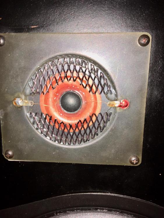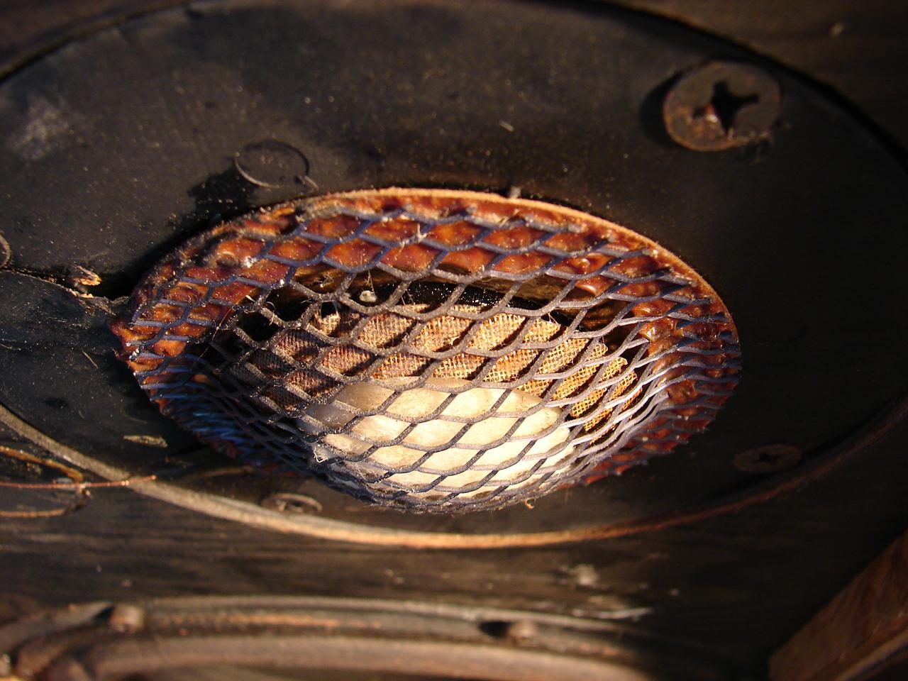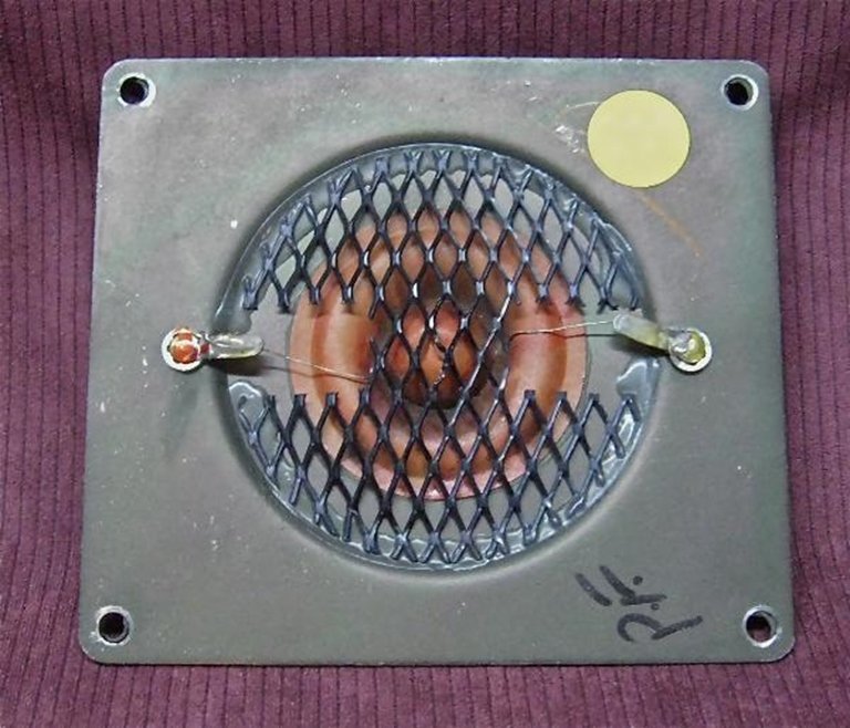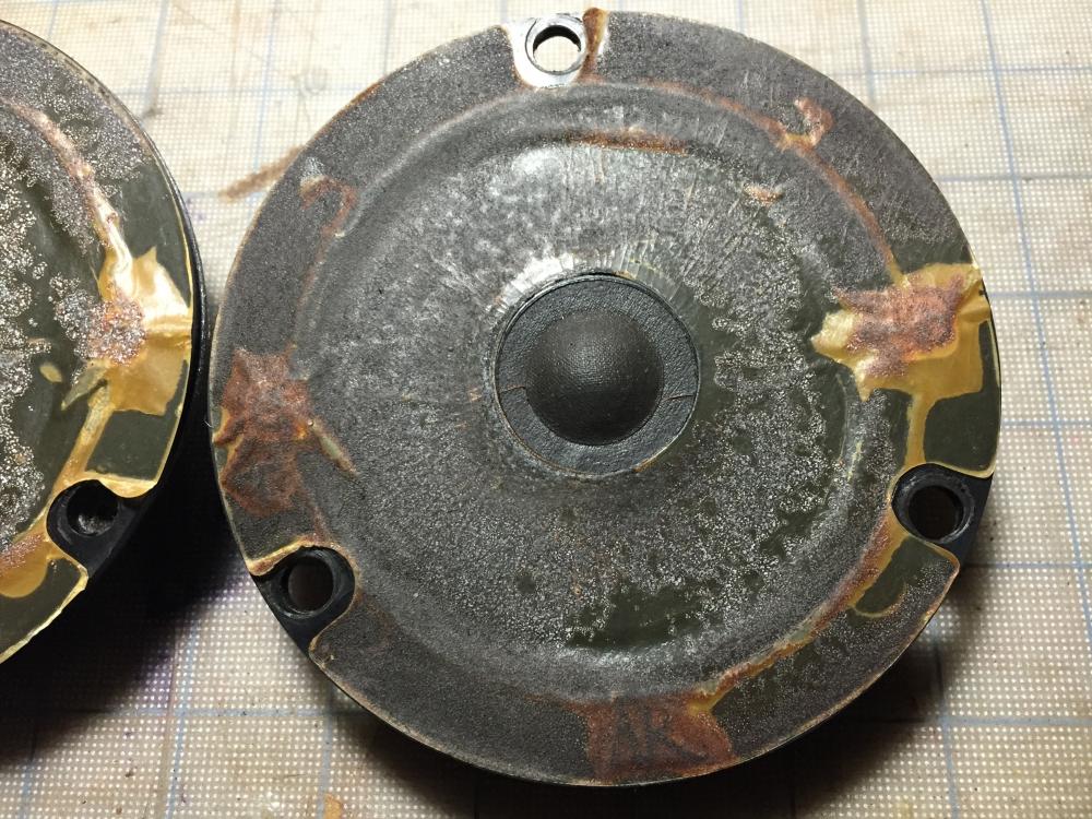 Вернёмся к СЧ. У оригинала он диаметром 40 мм и купол из бакелитовой ткани. Опять же, в качестве подвеса капельки "поролона", но потом ещё тонким латексом промазаны по периметру, получив аналог подвеса. Внутри, под куполом было прилично звукопоглотителя, который немног давил на купол. Для симметрии они снаружи приклеили сетку под которой тоже звукопоглотитель, который тоже слегка давил на купол. Думаю на приложенных фото можно всё увидеть.