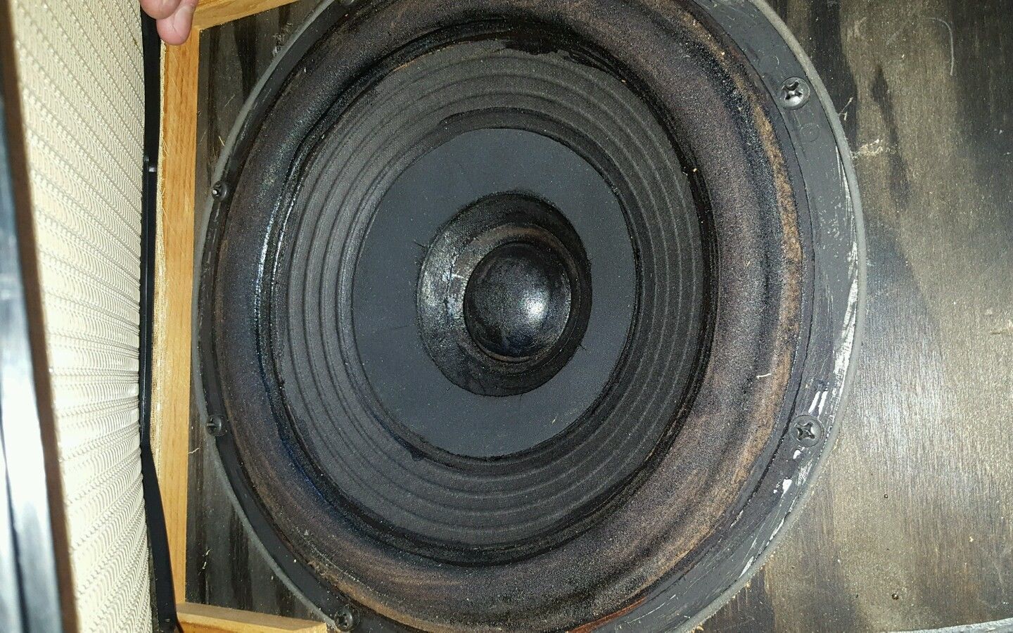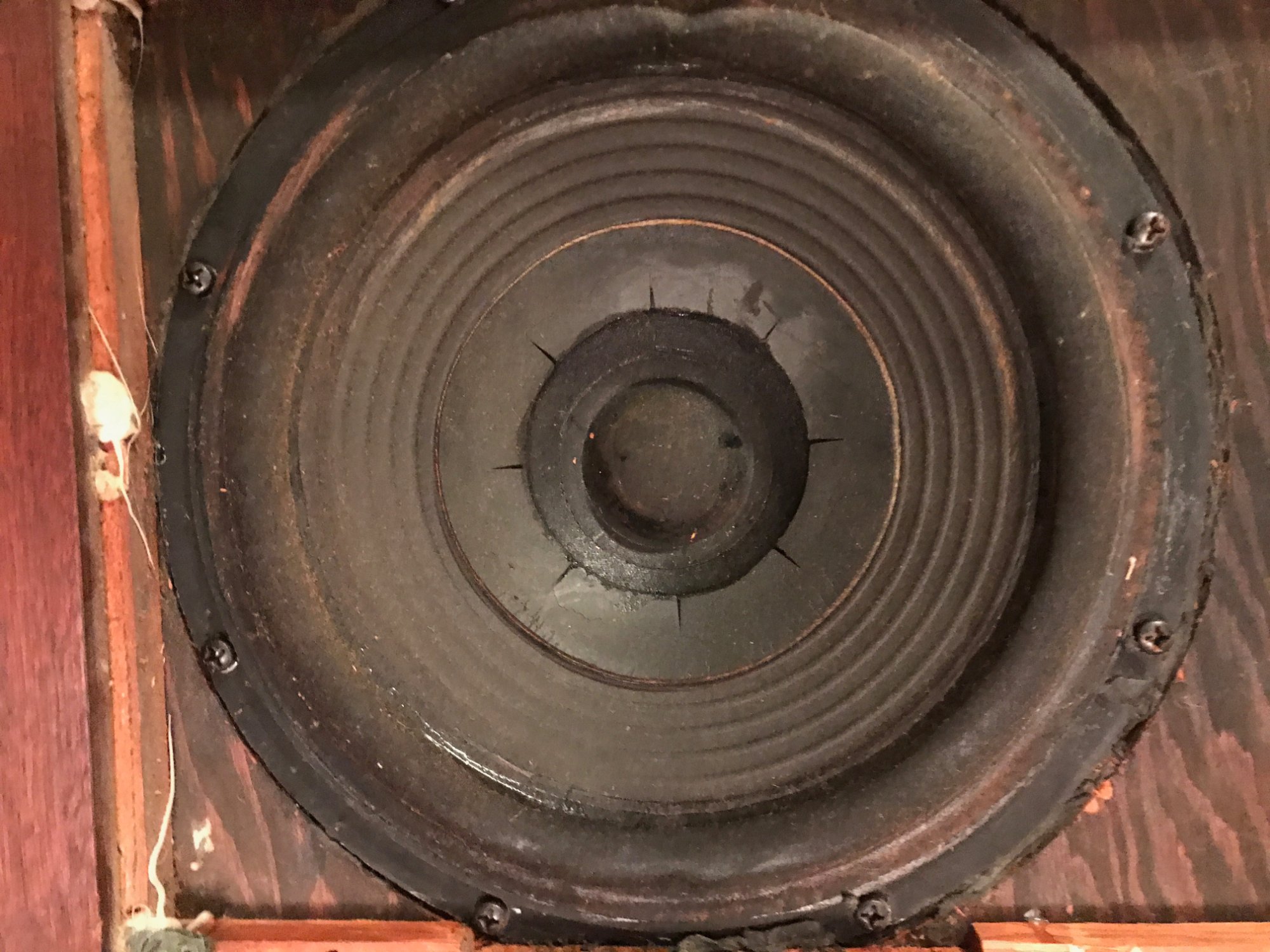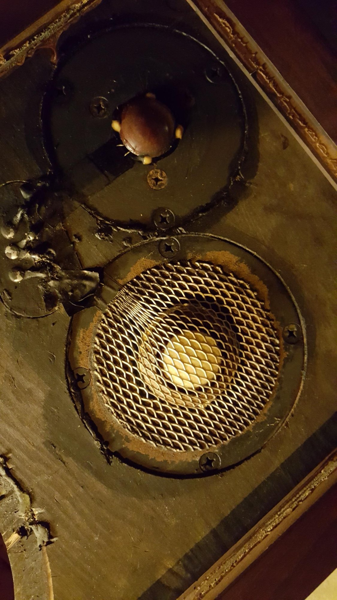 Вернёмся к СЧ. У оригинала он диаметром 40 мм и купол из бакелитовой ткани. Опять же, в качестве подвеса капельки "поролона", но потом ещё тонким латексом промазаны по периметру, получив аналог подвеса. Внутри, под куполом было прилично звукопоглотителя, который немног давил на купол. Для симметрии они снаружи приклеили сетку под которой тоже звукопоглотитель, который тоже слегка давил на купол. Думаю на приложенных фото можно всё увидеть.