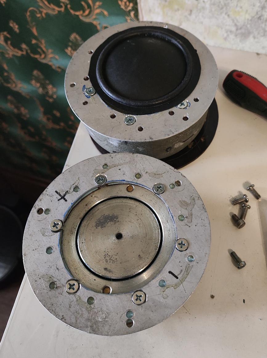 Руки у меня не совсем прямые и сильно зависят от вдохновения. С МС от 1А-20 у которых самый узкий зазор я сильно намучился с намоткой и центровкой. Вроде получилось чтоб не цепляло, но я всё равно забраковал. Хоть и вроде нормально звучало. У МС от кричалки магнит самый слабый и высота зазора маленькая, он сошёл с дистанции, хоть тоже как-то звучал. У 4а32 уж слишком широкий блин магнита, он не помещался в ящик и я остановился на Теслах. Тем более что хоть у оригиналов купол 40 мм и его хватало для стыковки с 10" и даже 12" НЧ, но с 52 мм куполом мне было спокойнее.