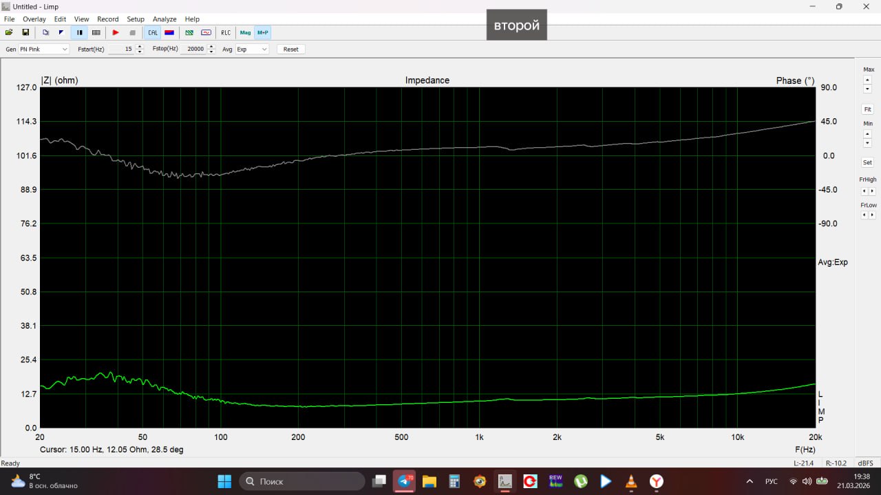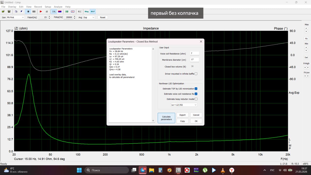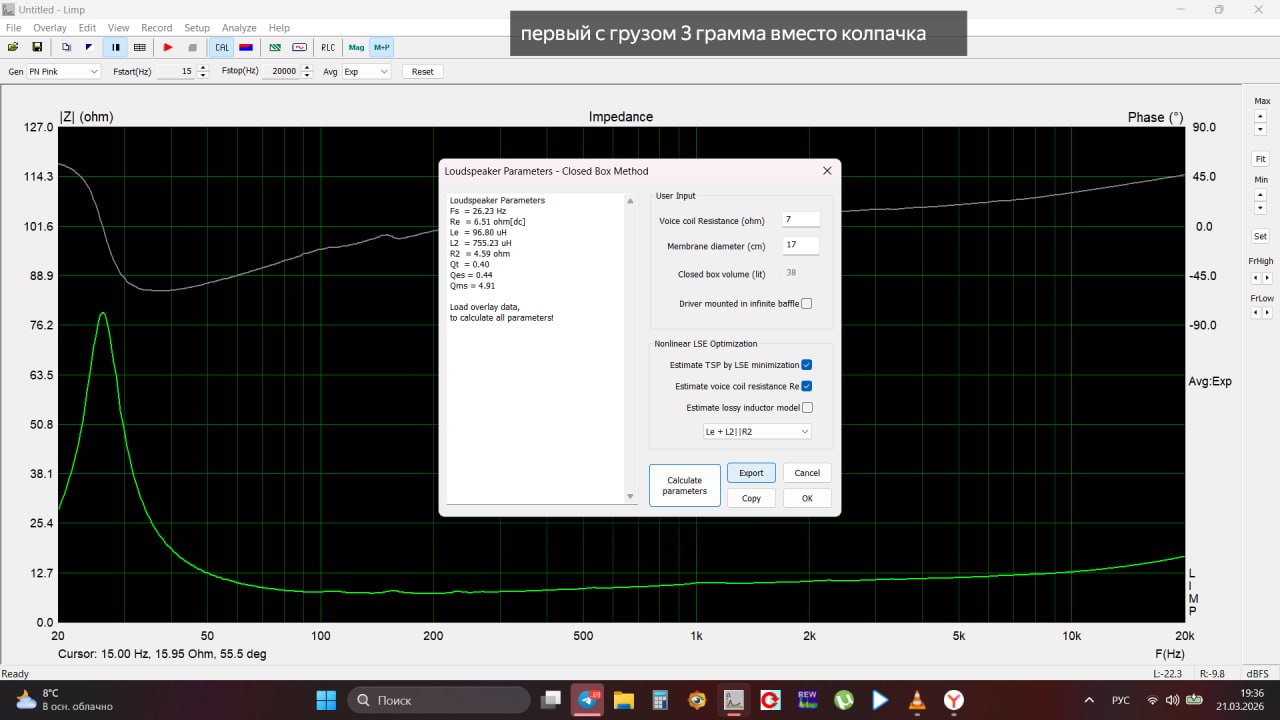 Вот смотрю на параметры и фигею. Специально мотал высокую катушку чтоб провода в зазоре не было слишком много. Магнит хоть и крупный, но там широкий зазор плюс медь и в итоге индукция небольшая. И всё равно в итоге добротность вышла низкая. Да, она частично из-за низкого резонанса, будь резонанс 35-40 Гц, она была бы выше, но всё же.. Ну хоть не 0,2 как раньше.
