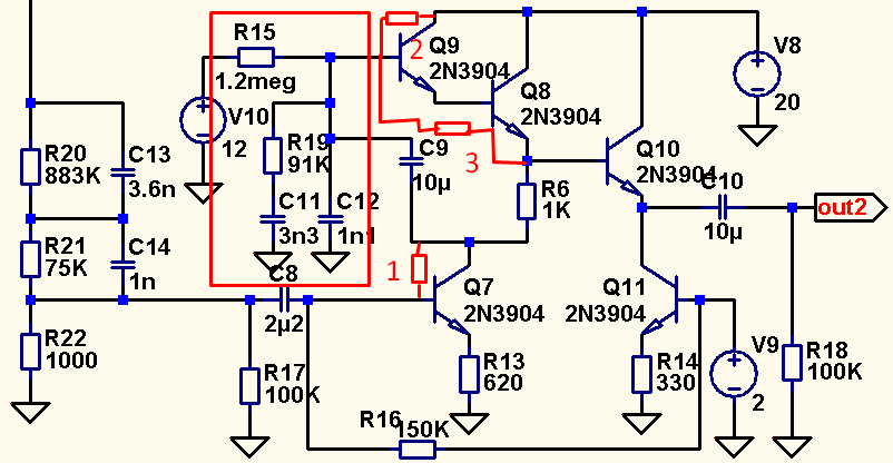 3. Линейность повторителя Т10 повышена установкой дополнительных Т8Т9 для динамического изменения тока ГСТ нагрузки Т11.