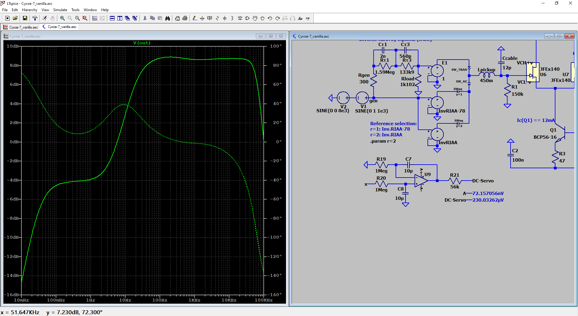 Я же предупреждал, что постоянный ток через цепь RIAA, - из-за сильно-ненулевого выходного напряжения, - вызовет шум.