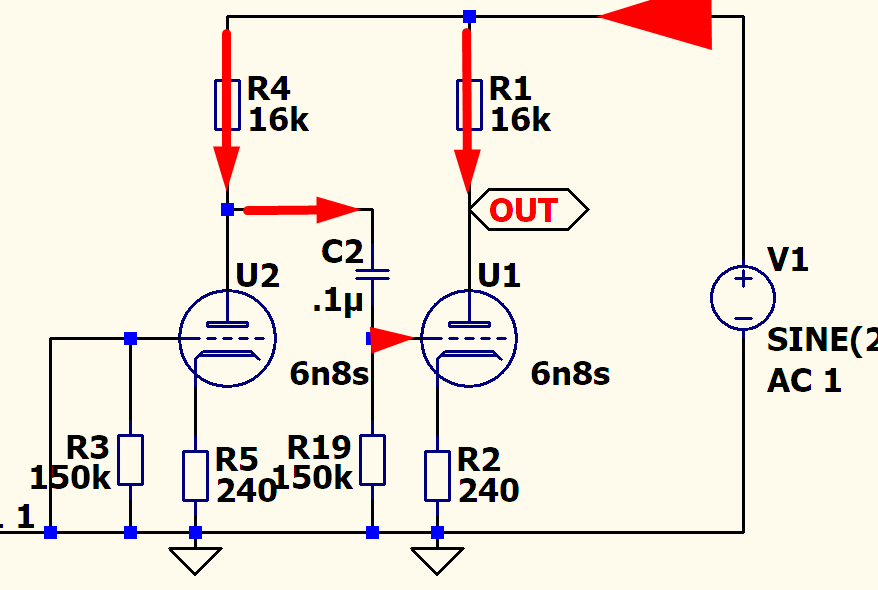 Видно, что помехи лезут открытой прямой дорогой через резисторы нагрузки прямо на анод и в выход каскада. Единственное, что с ними борется - это выходное сопротивление лампы:
