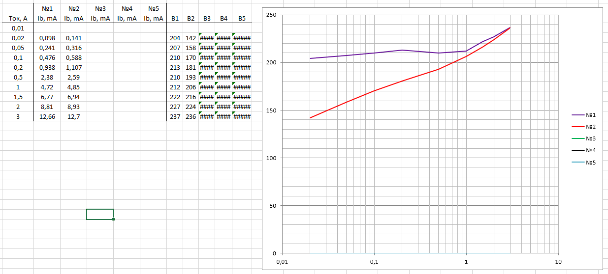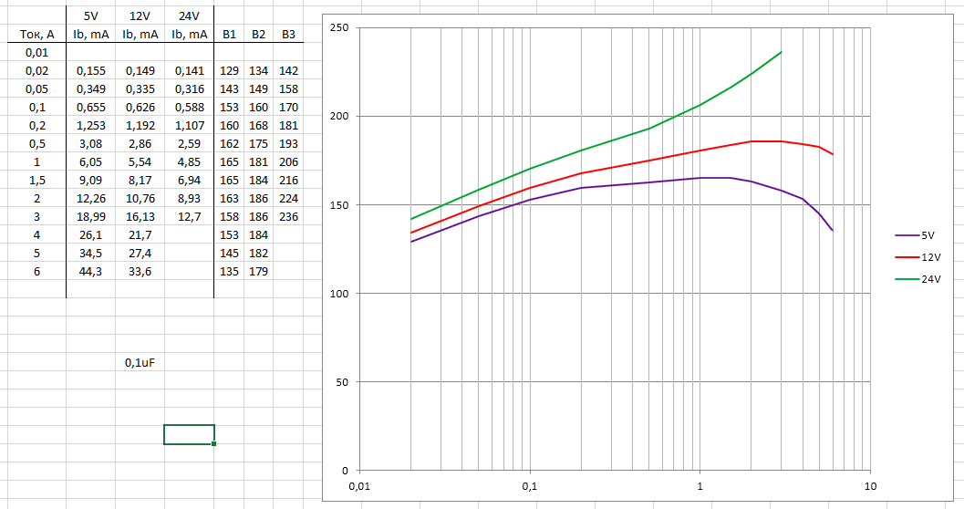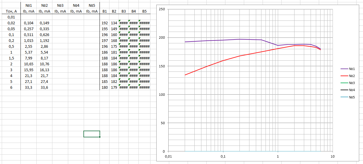 Начинаю снимать характеристики на токах 20-50-100 мА - наблюдаю какую-то нестабильность базового тока, чего не было с другими транзисторами. Ткнул осциллографом - возбуд показывает, не помню, на частоте 0,5 или 1,5 МГц. Включил резистор антизвона на 10 Ом в базу и зашунтировал цепь коллектор-база конденсатором 1500 пФ, стало нормально. Вставил в таблицу.