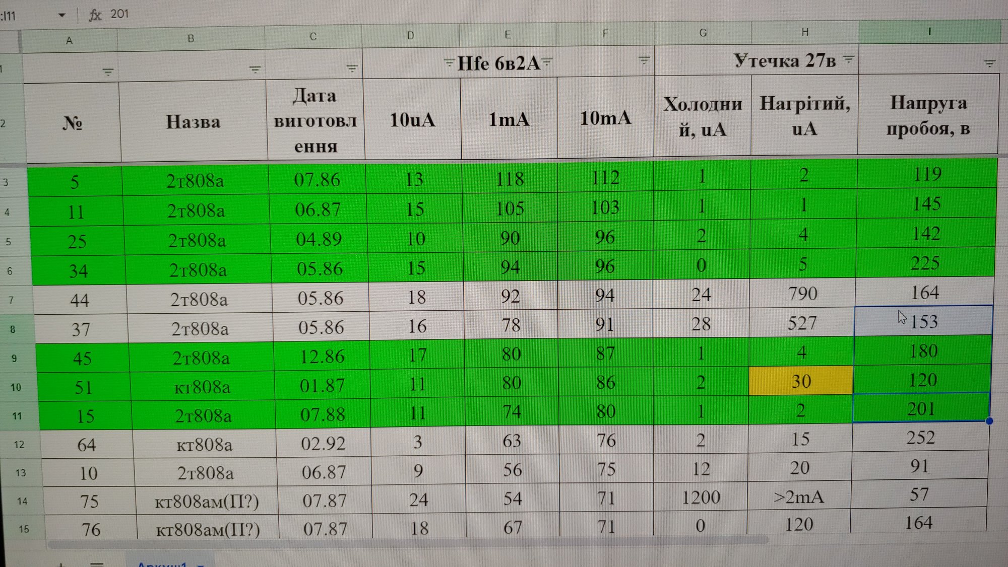 Вот таблица, всех К(2)Т 808а что я перебрал. В кучу замерил кт808ам,но похоже, в некоторых вообще левый кристалл, а кт808ам(П) скорее всего подделка заводская, ибо корпус как у дешевого китая.