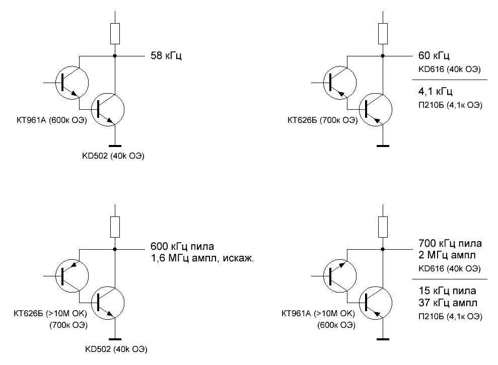 Для чистого результата я зашунтировал бы базы выходных триодов резисторами нужного номинала, скажем, 1 к для кремния и 100 Ом для германия.Схема с общим эмиттером (ОЭ) выходного транзистора